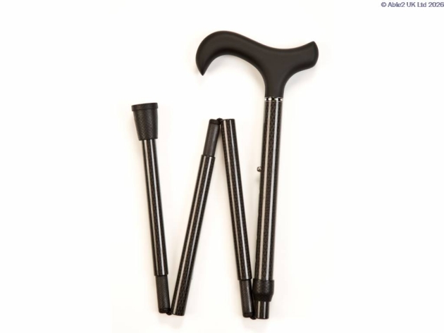 An adjustable, folding carbon fibre walking stick in black, with a subtle diamond pattern, and a soft grip derby handle. This stick comes with a free clip and adjusts from 33-37", and can be cut down further if required. The 4 part stick folds up to 12.5", and fits well in shoulder bags, handbags and rucksacks.