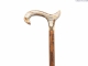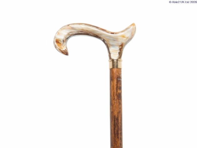 A brown beech cane, fitted with an acrylic derby handle, inlaid with a coffee marbled effect. Fitted with a rubber ferrule.