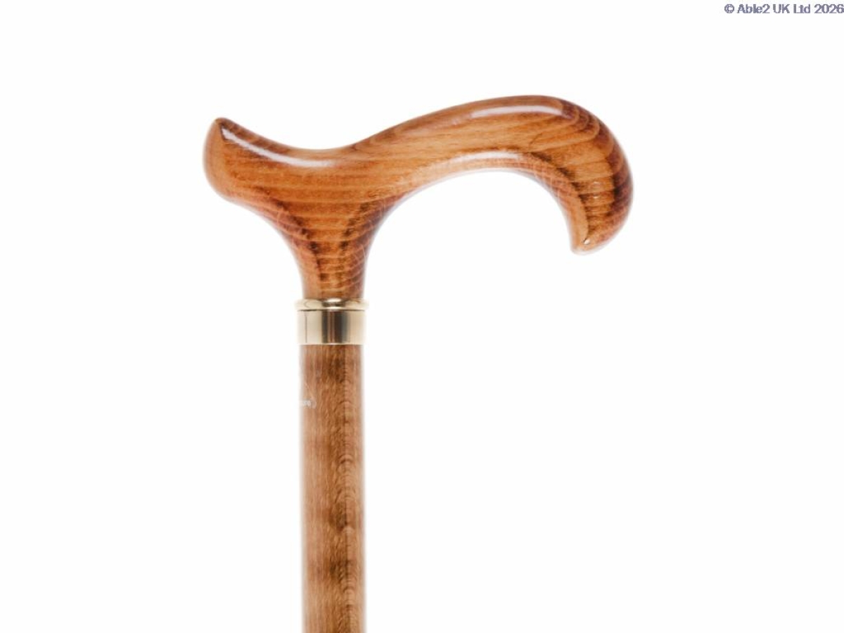 An elegant beech cane, with a scorched finish, fitted with a derby handle, suitable for everyday use, with a decorative brass collar. Fitted with a rubber ferrule.