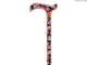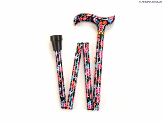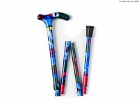 A folding, adjustable walking stick in blue and red floral pattern, with a patterned derby handle, and bronze coloured collar. This stick adjusts from 33-36.5" and can be cut down further if required. The 4 part stick folds up to 11.5", perfect for bags. Packaged in a plastic wallet and with a free clip.